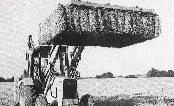 Picture: the Flintstone bale collector was a popular product to collect big bales. To honor its name, Meijer made a rather pointless roof on the collector to make it look like the Fred Flintstone car. No function, but it looked awesome!